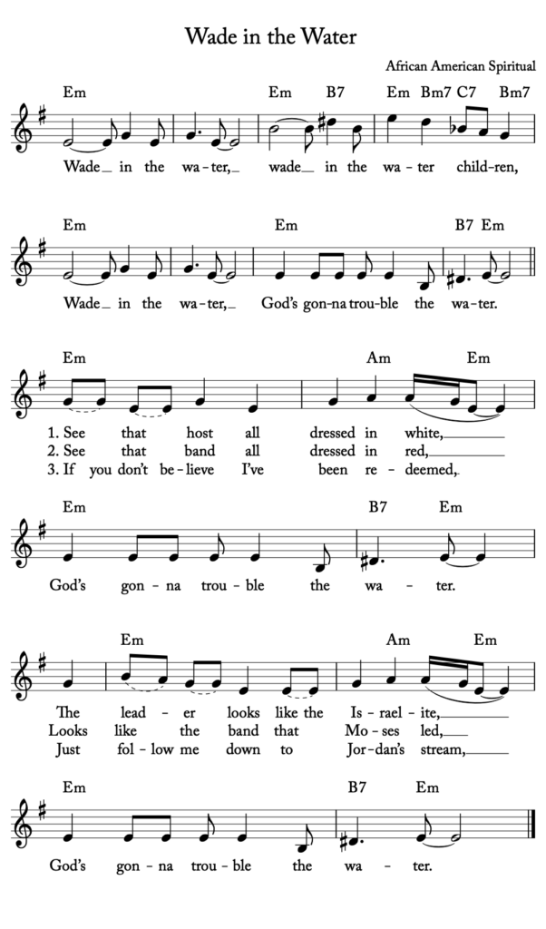 The rhythm on this is kind of hard to read (most American gospel, pop, and jazz music is); but, if you listen to a couple of recordings, you’ll find that it’s pretty easy to do it. Don’t forget to sing the eighth notes with a swing rhythm.