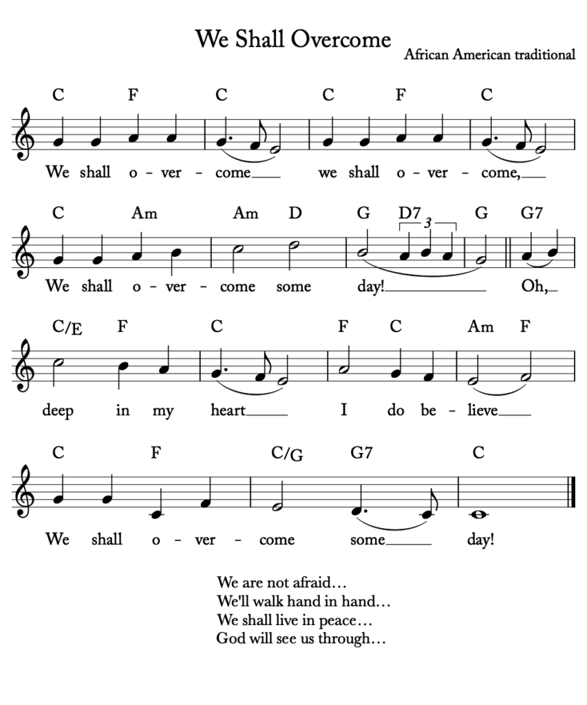 I’m not saying that this isn’t a good song but I can’t sing this any more. I’m old and I remember the Vietnam War, the assassinations of Dr. King and the Kennedy brothers, the war in Nicaragua, the Gulf War and the War in Iraq, the seemingly endless mass murders in schools, churches, synagogues, supermarkets and in the streets; and now the present horror show with concentration camps in authoritarian countries that are unaccountable to the citizens of the United States. The increase in stateless people in endless peregrination as they search for a place to settle has long been foreseeable given the totally predictable damage we are doing to the environment. Yet we who foresaw it have been incapable of doing anything to prepare for this time, while those who use cruelty and viscousness as their tactic of choice to enrich themselves leapt on the unprotected. The truth is, I am not certain that we shall overcome. Yet, the joy I take in building solidarity with the poor and the good-hearted is very great. What is a collection of protest songs without, We Shall Overcome? The PDF has two harmonized versions, the second one is very churchy, with a kind of Southern Baptist feel to it. You could play it on a Wurlitzer organ with the vibrato turned up high to get the full effect; and I have just added an arrangement for brass band for which I wrote a descant obligato for piccolo, which I am stupidly proud of.